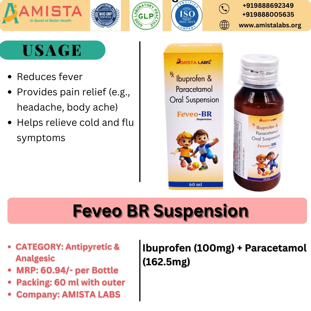 Feveo-BR Suspension from Amista Labs is a pediatric-friendly combination medicine formulated to provide effective relief from fever, pain, and inflammation. It contains a synergistic blend of two well-known and widely prescribed medicines—Ibuprofen IP 100 mg and Paracetamol IP 162.5 mg—making it a reliable choice for managing common childhood conditions associated with fever and mild to moderate pain. The pleasant liquid formulation ensures easy administration and better acceptance among children.
