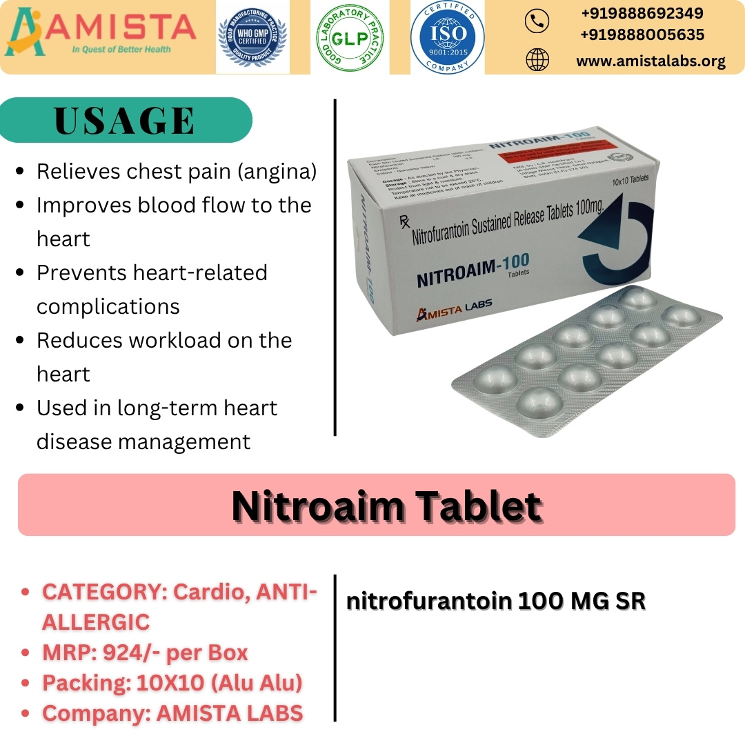 Amista Labs manufactures NitroAim-100 Tablets as a reliable and clinically proven antibiotic formulation containing Nitrofurantoin Sustained Release 100 mg. Healthcare professionals prescribe this medicine to treat and prevent urinary tract infections (UTIs) caused by susceptible bacteria. With its sustained-release technology, NitroAim-100 delivers prolonged therapeutic action, improves patient compliance, and ensures effective bacterial control in the urinary tract.