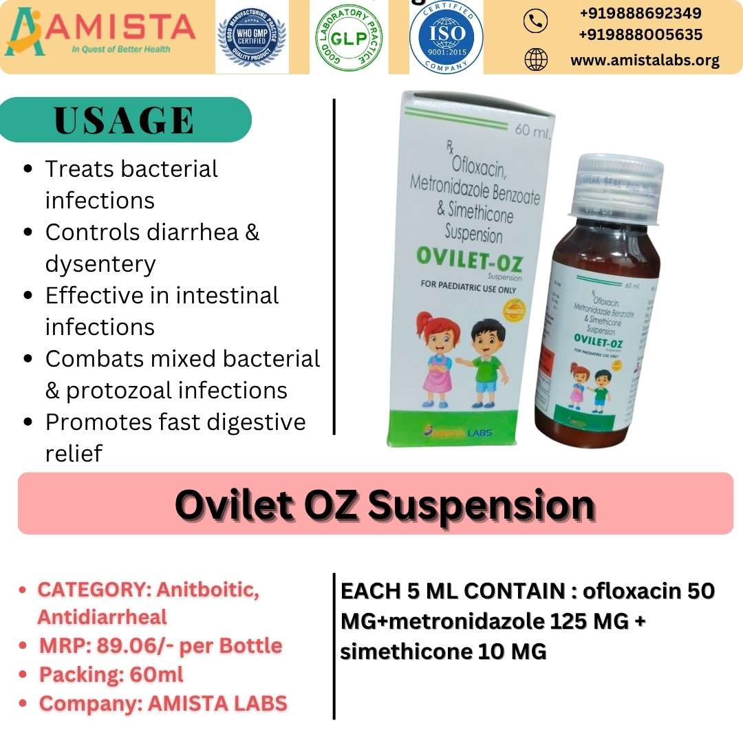 Ovilet-OZ Suspension by Amista Labs effectively treats gastrointestinal infections and digestive discomfort in children. It combines Ofloxacin, Metronidazole Benzoate, and Simethicone to deliver broad-spectrum antimicrobial action while relieving gas and bloating. Amista Labs has specially formulated this suspension for paediatric use only, ensuring safety, palatability, and accurate dosing for children.